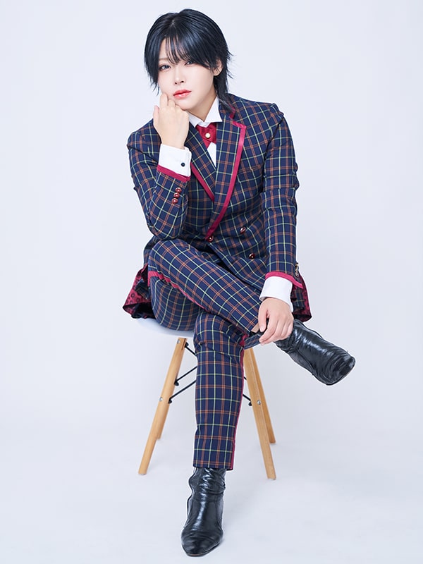 深みのあるネイビーチェックに、サテンレッドのパイピングが走るジェンダーレスなセットアップ。