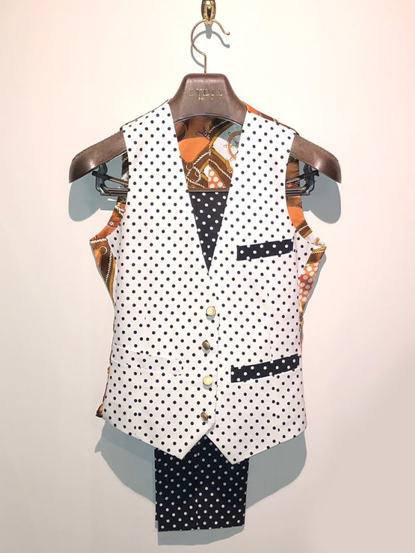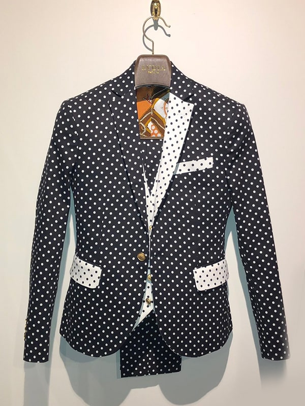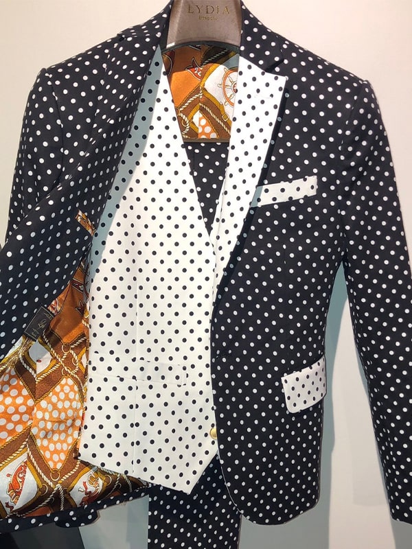 細かいポルカドットがバランス良くカジュアルダウンしているので親しみやすい印象に。
