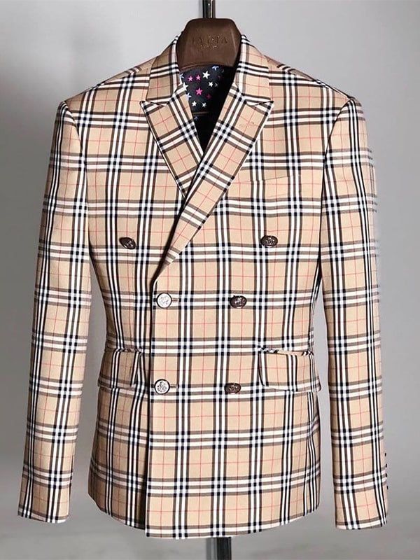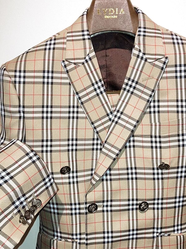 どこか懐かしさを感じさせるカントリータータンチェック柄のダブルスーツ。