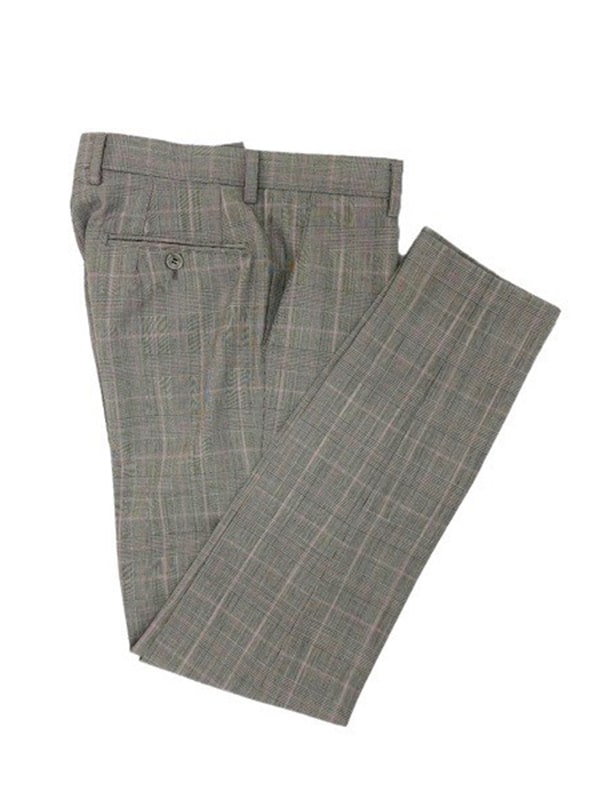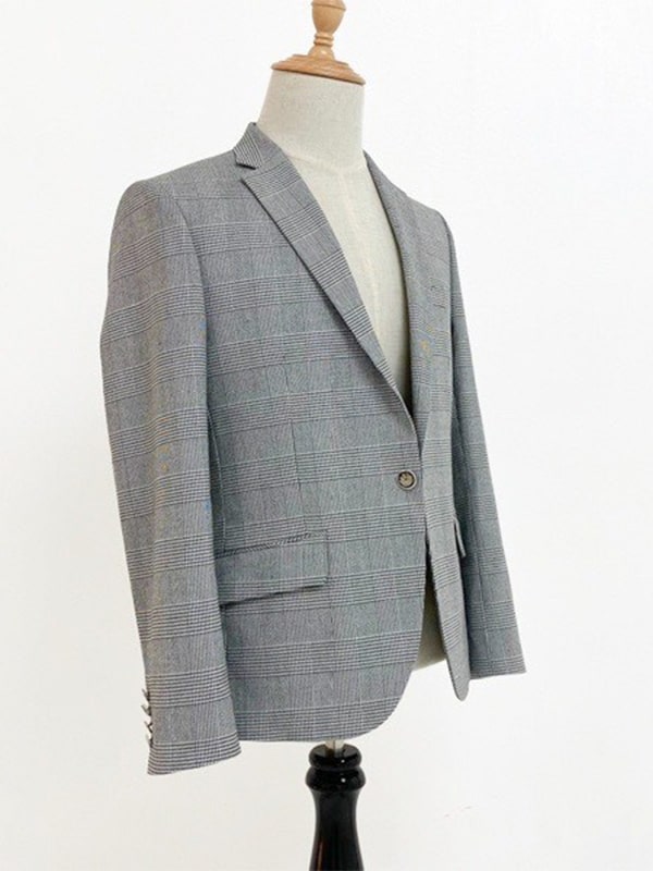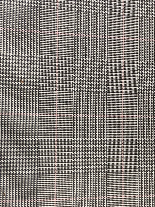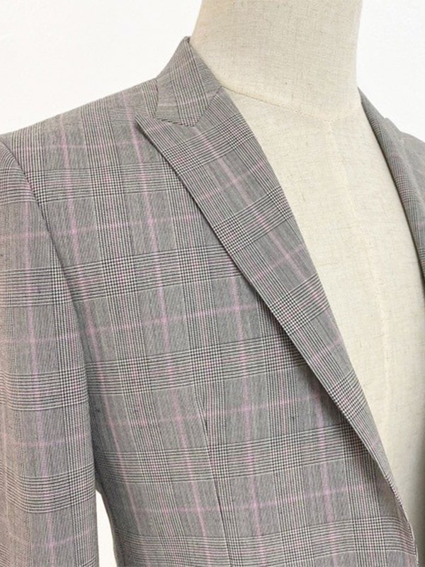 優しげなグレンチェック生地に淡いピンクの格子が入ったスーツ。