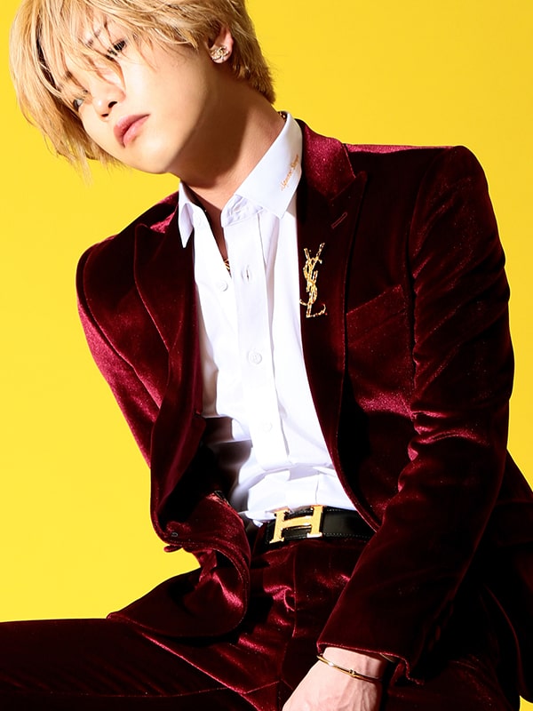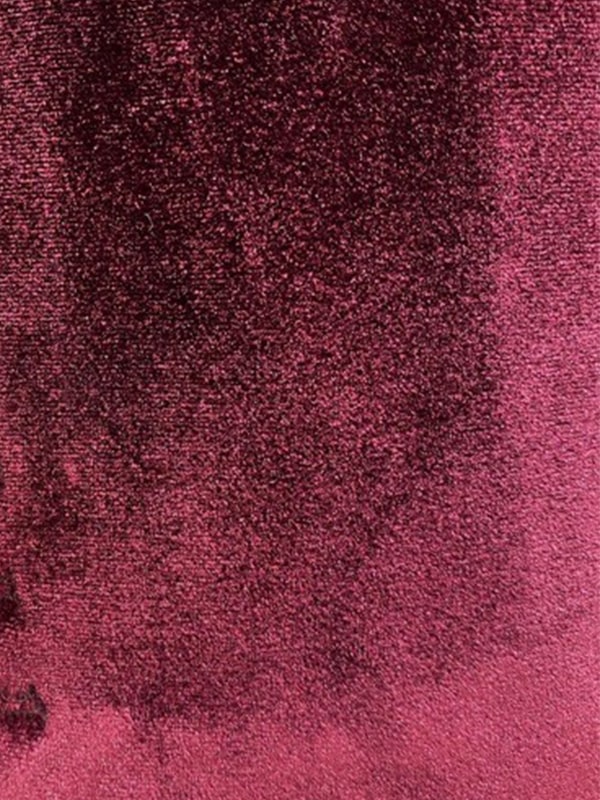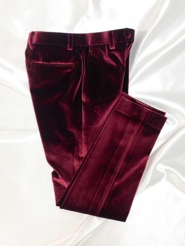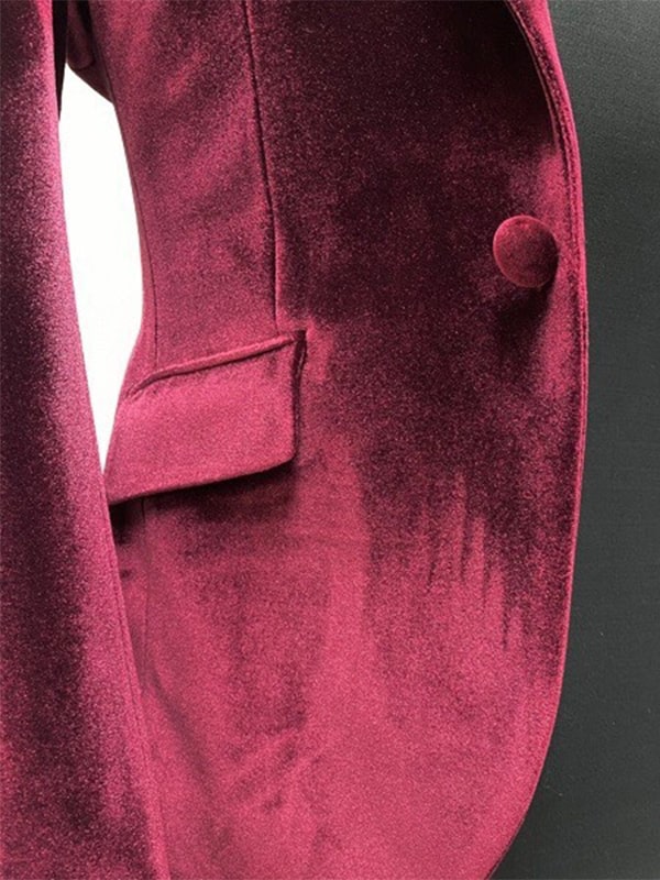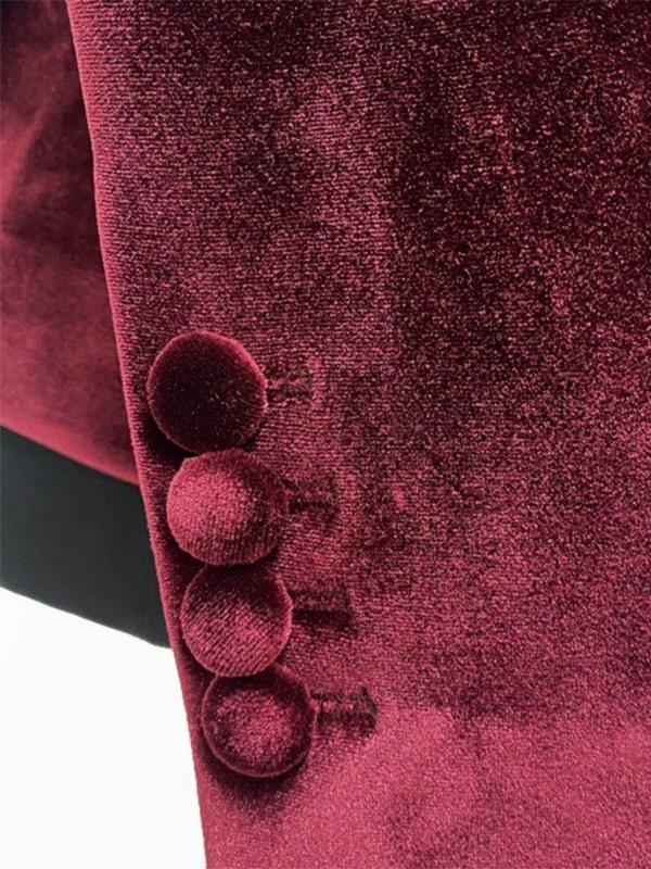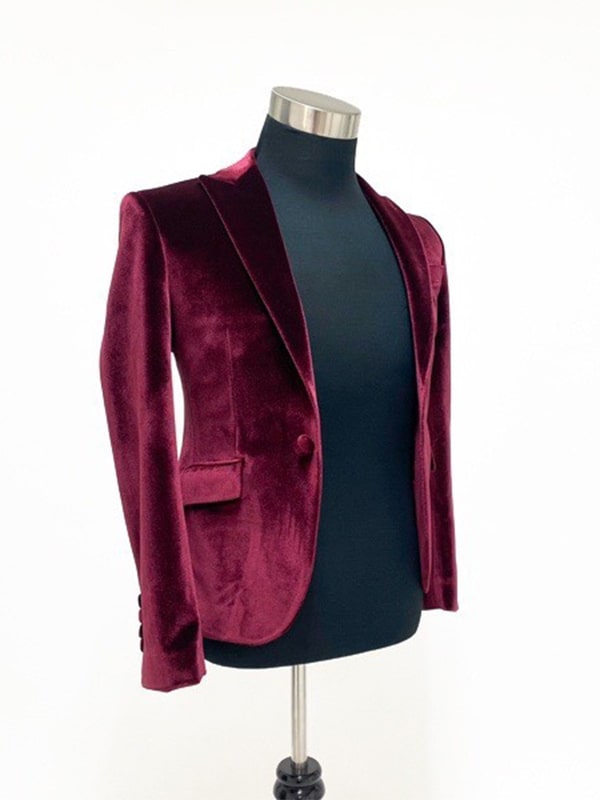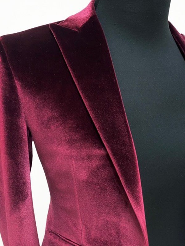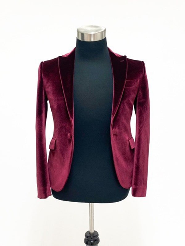 深みのあるバーガンディカラーのベロア素材スーツ。