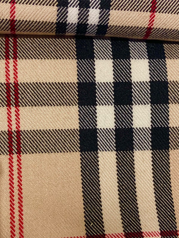 ベージュ生地にホワイト、ブラック、レッドの格子が入ったタータンチェックスーツ。