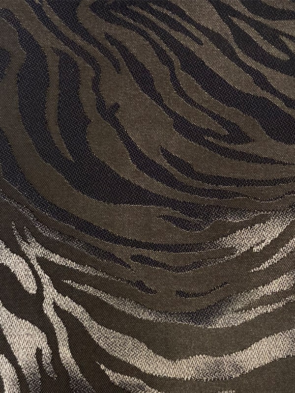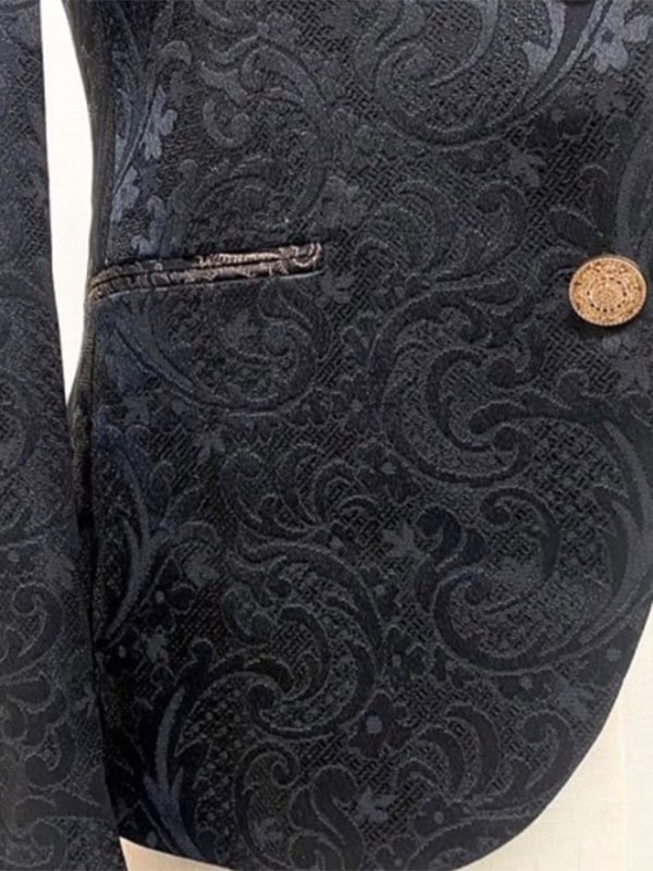 重厚感あふれるダブルのスーツには光沢のあるプランツ柄。