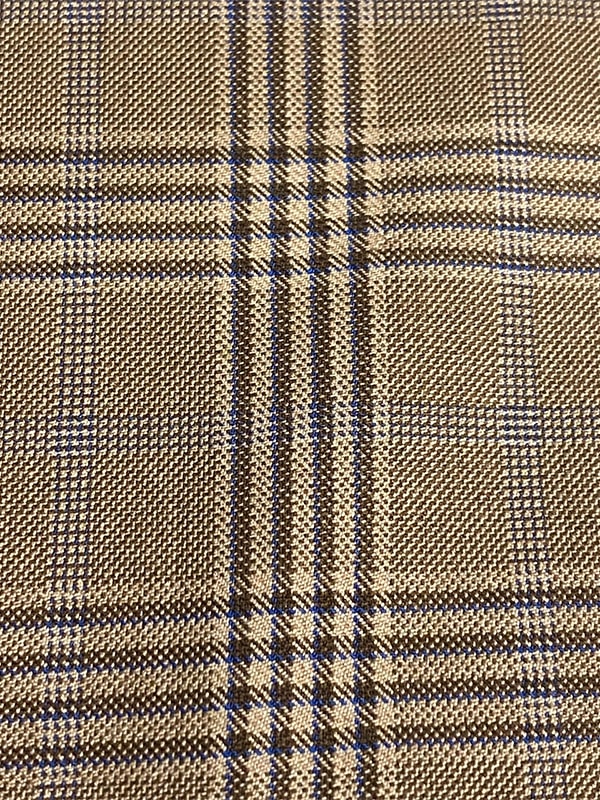ベージュチェックの生地にぴったりなダブルブレストデザイン。