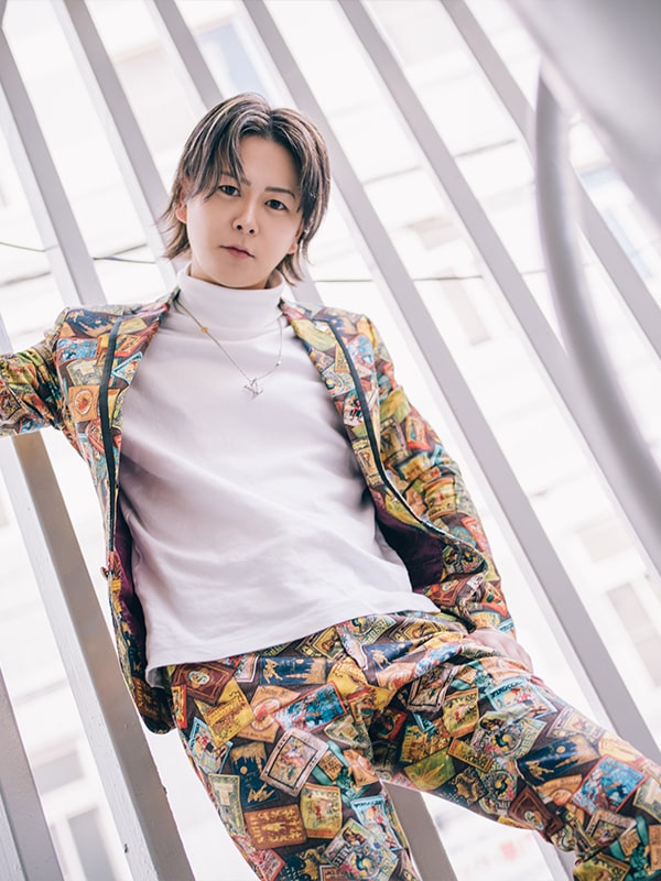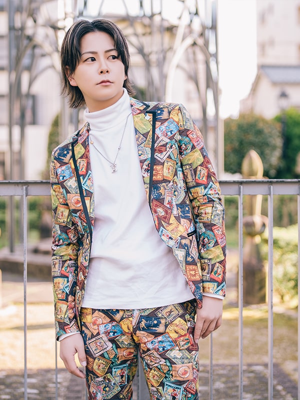 ド派手なインパクトを与えるカジュアルさと、ラペルのパイピングがマッチしています。
