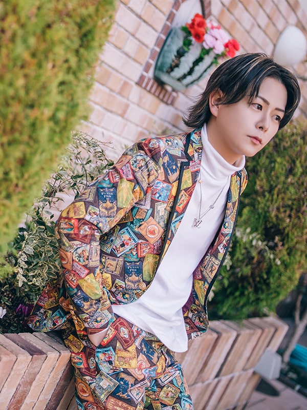 全体に本の表紙を散りばめた総柄2Pスーツ。