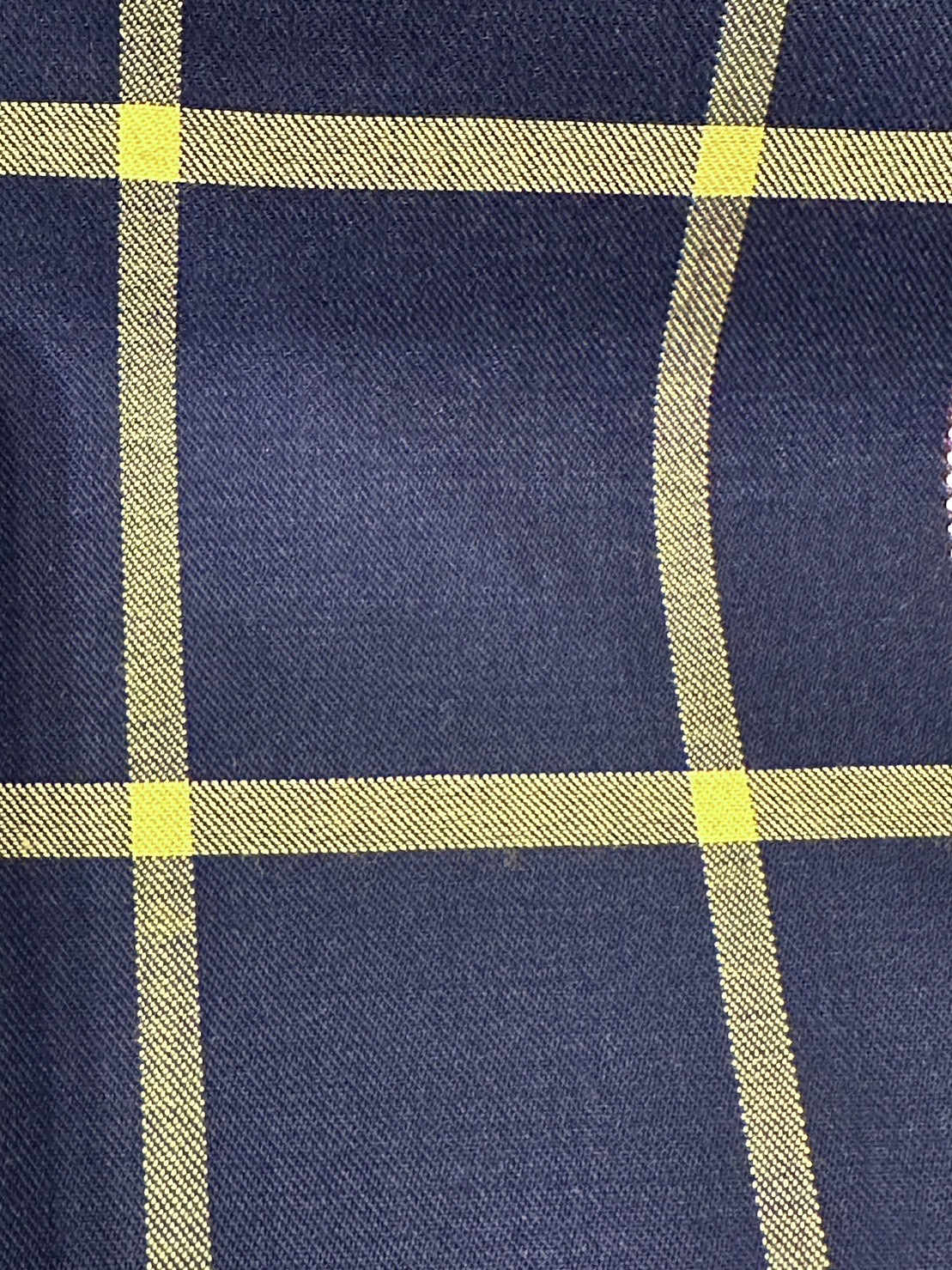 鮮やかなイエローチェックがネイビーのベースに映え、個性的な印象を与えます。