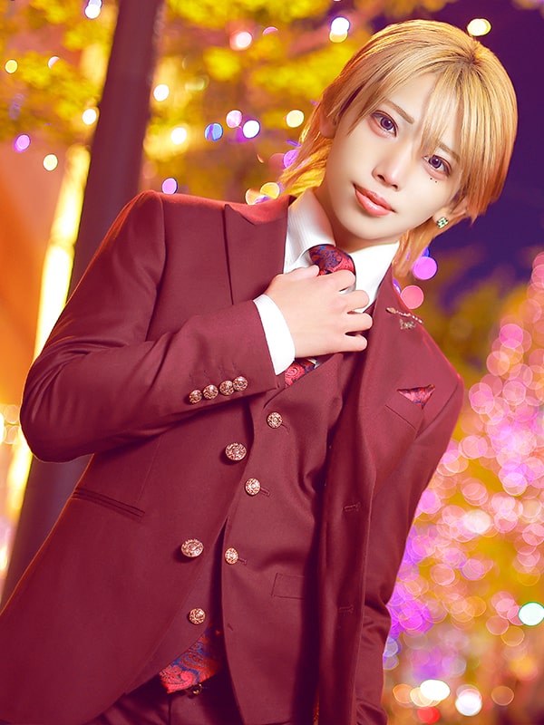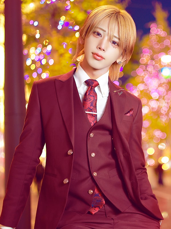 深みのあるボルドーのシングルジャケットにゴールドメタルボタンとピークドラペルを合わせ、華やかさと上品さを両立した3ピーススーツ。